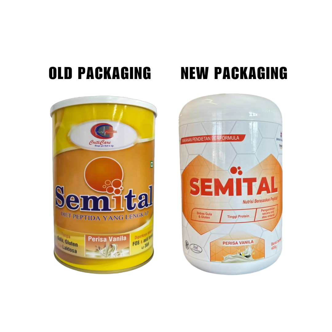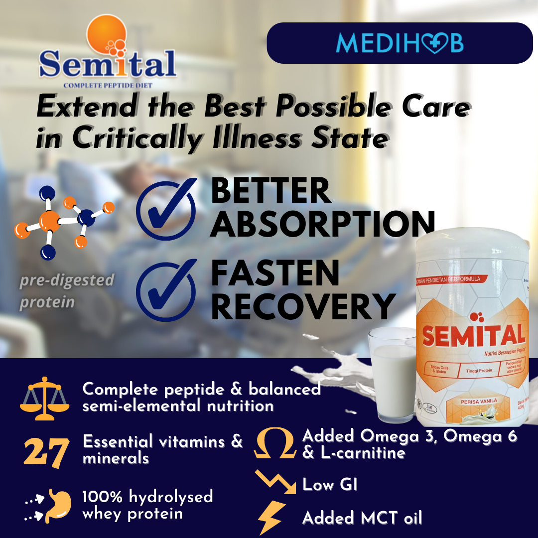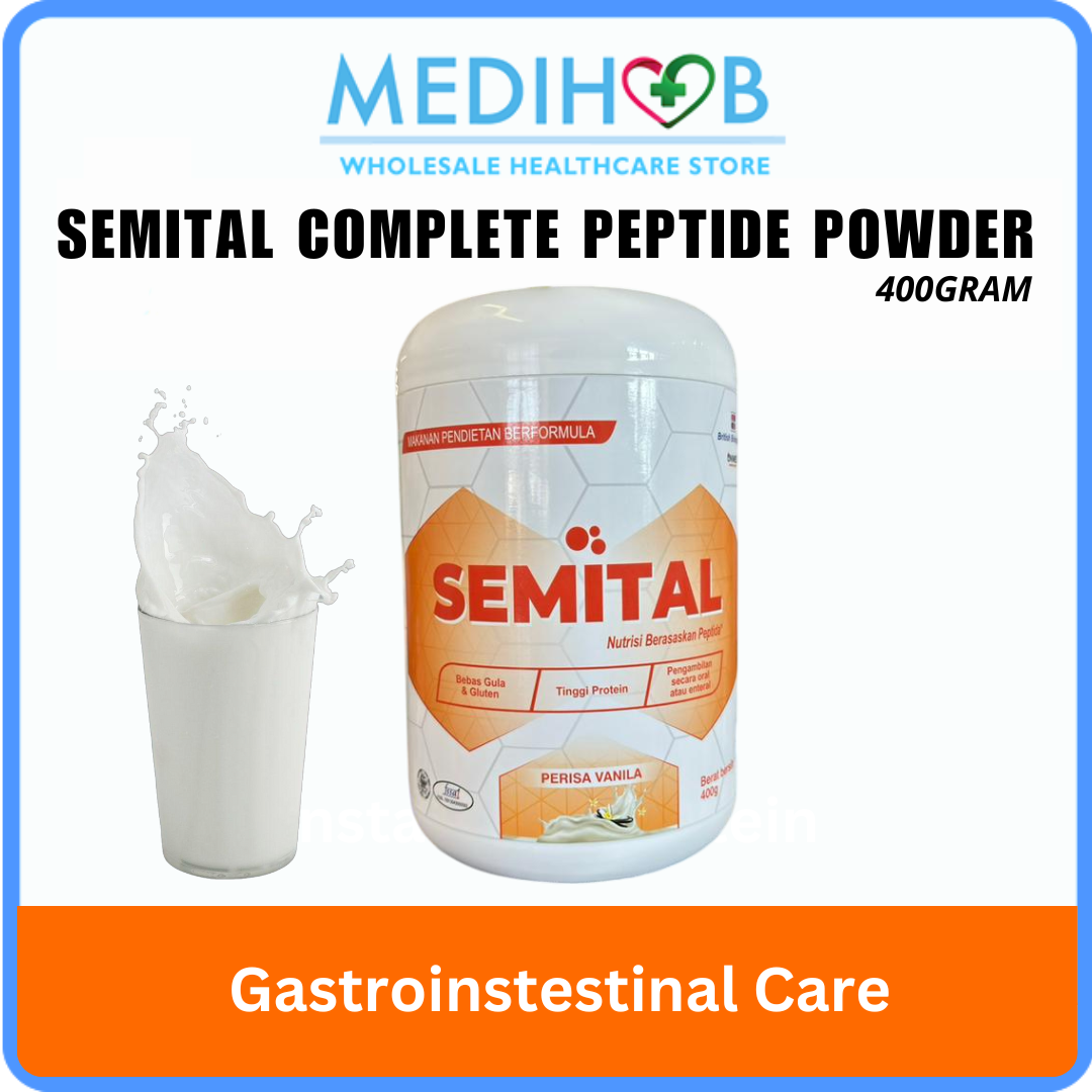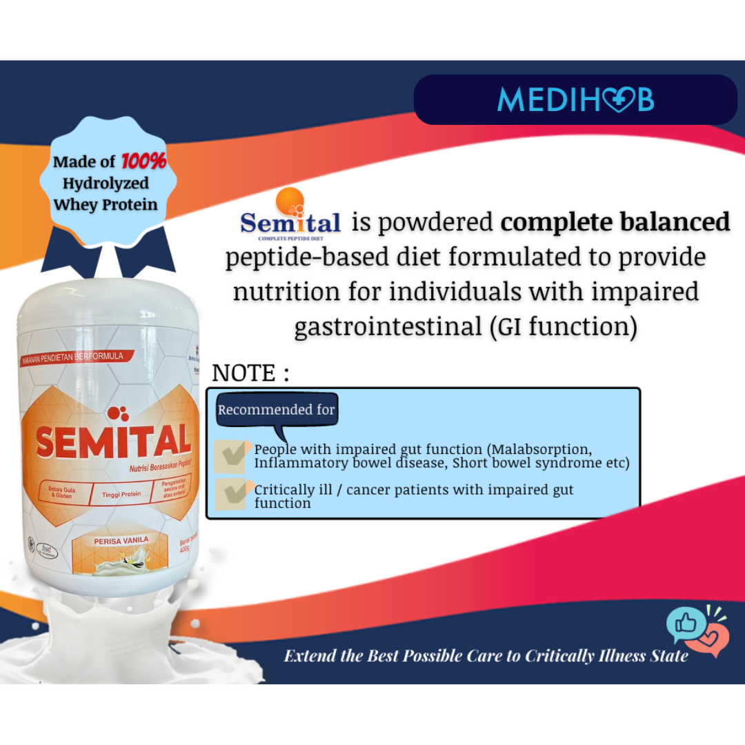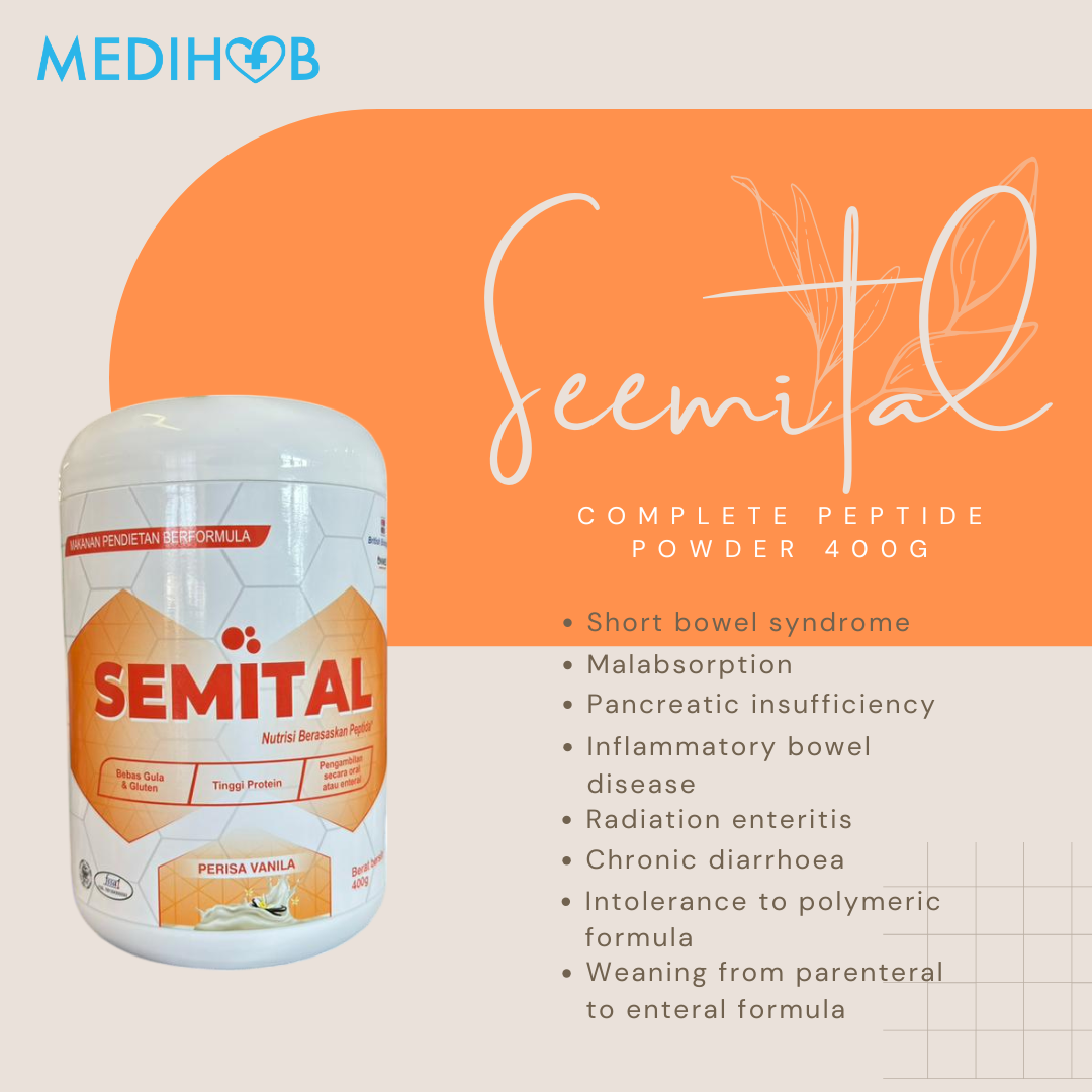 Semital is a complete peptide based diet containing 100% Hydrolyzed Whey Protein (pre-digested protein), Dietary Fiber, 60% of the fat content from MCT (Medium Chain Triglycerides), Omega 3 and 6 fatty acids and 27 essential vitamins and minerals indicated for patients with inflammatory bowel disease, short bowel syndrome, pancreatic insufficiency, radiation enteritis, chronic diarrhea and intolerance to polymeric formula.